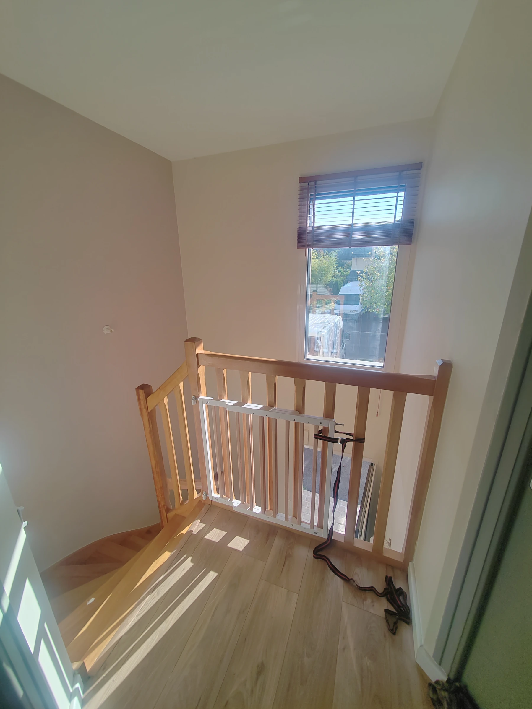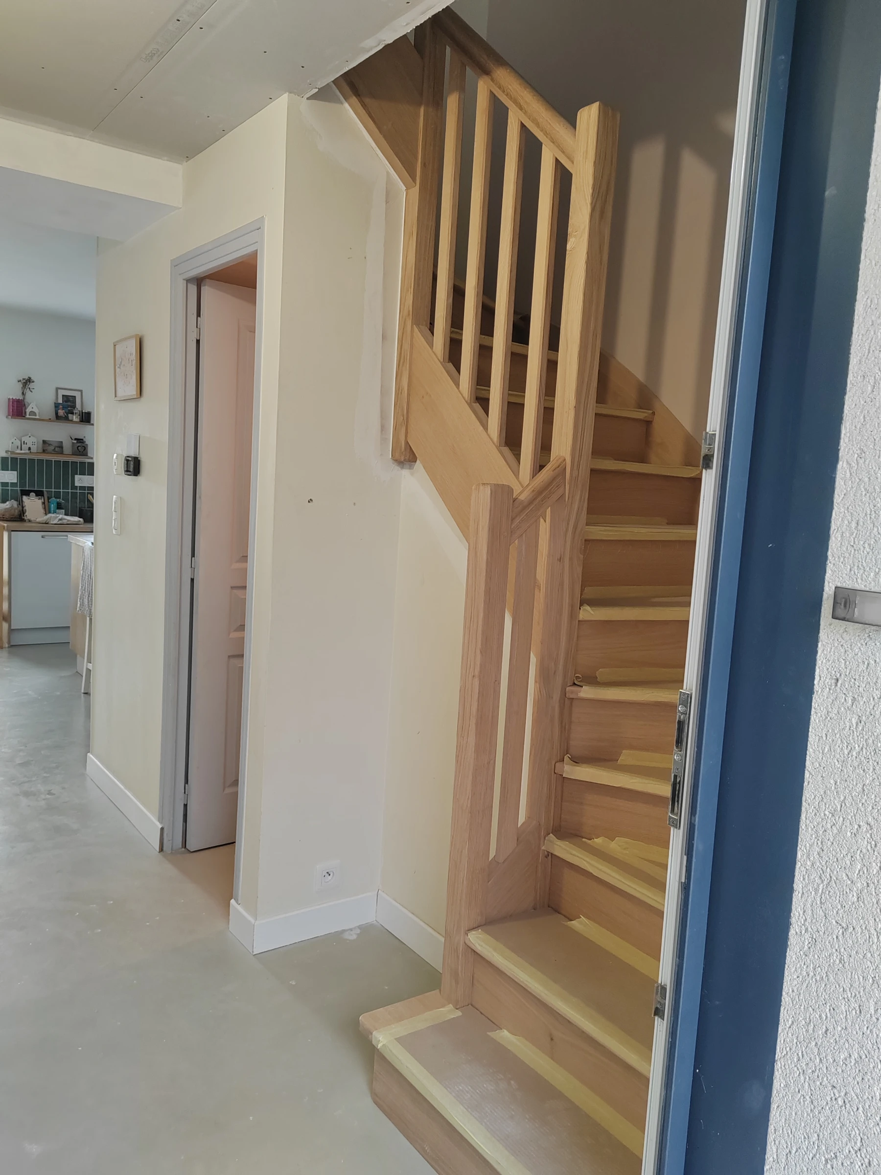 Enfin, l'ancien escalier a été remplacé par un escalier 2/4 tournant en chêne massif, fabriqué sur-mesure par les Escaliers Raux-Gicquel, artisans bretons.