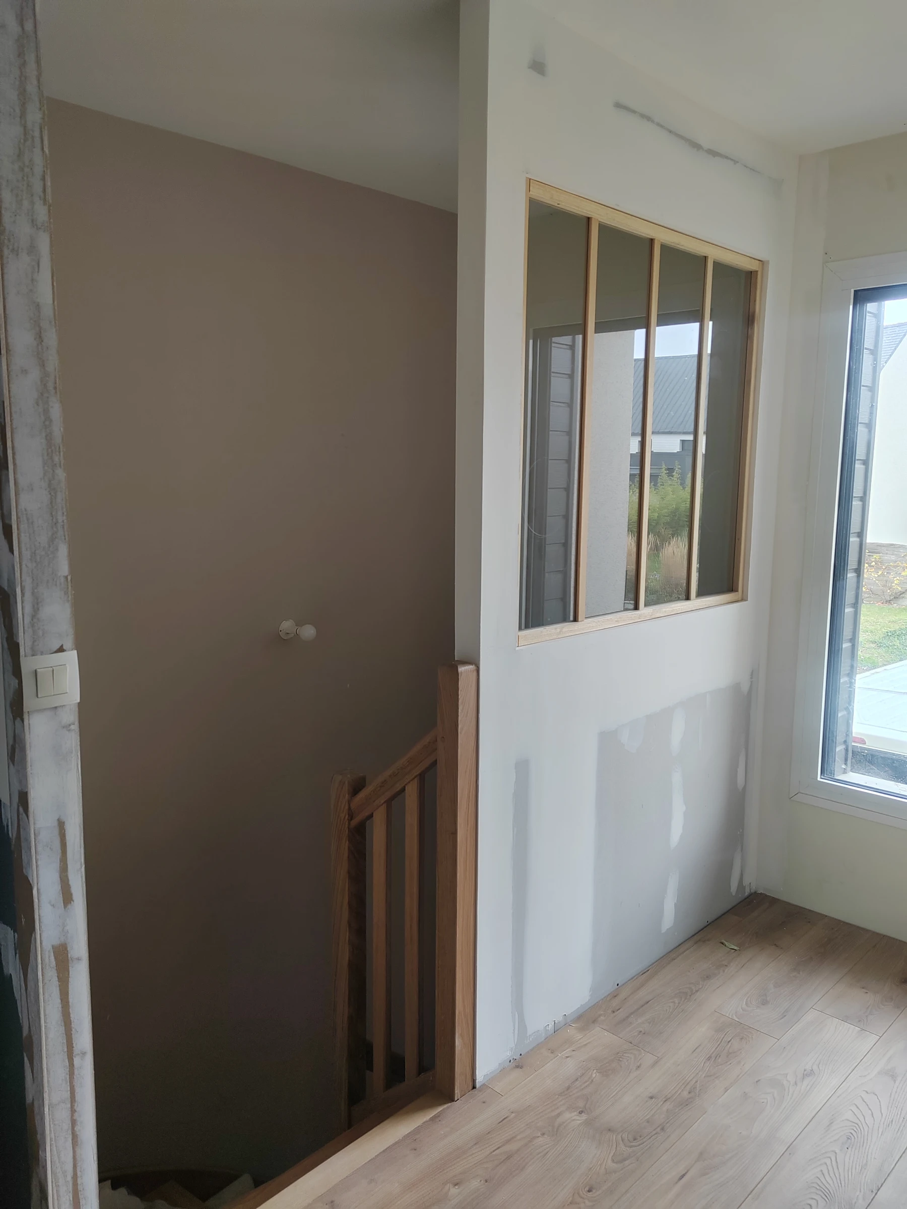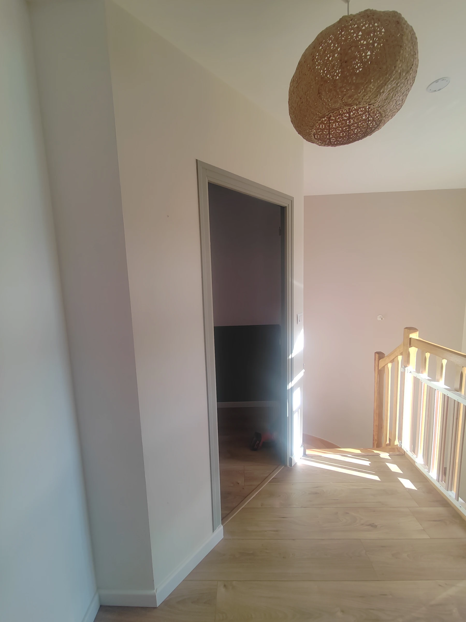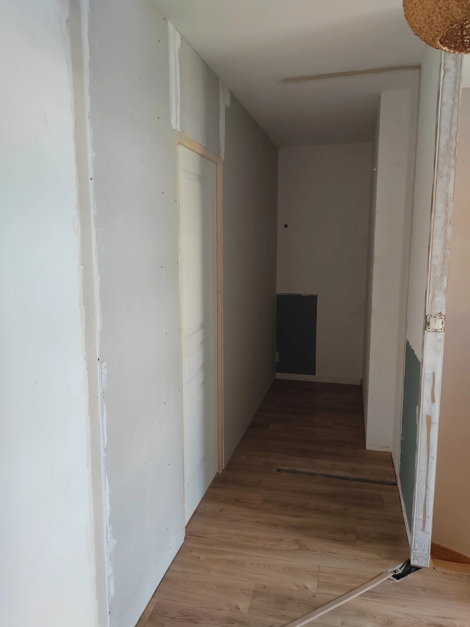 Nous avons déplacé une cloison de chambre pour créer un nouveau couloir sur ossature métallique, isolé à la laine de verre pour une isolation phonique et thermique performante.